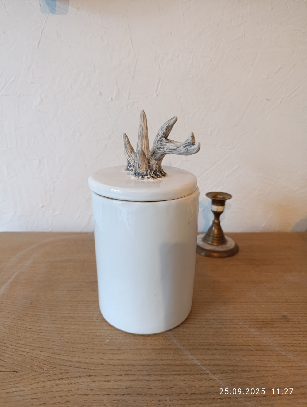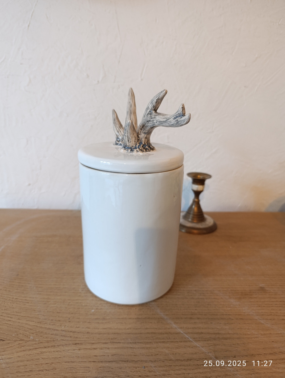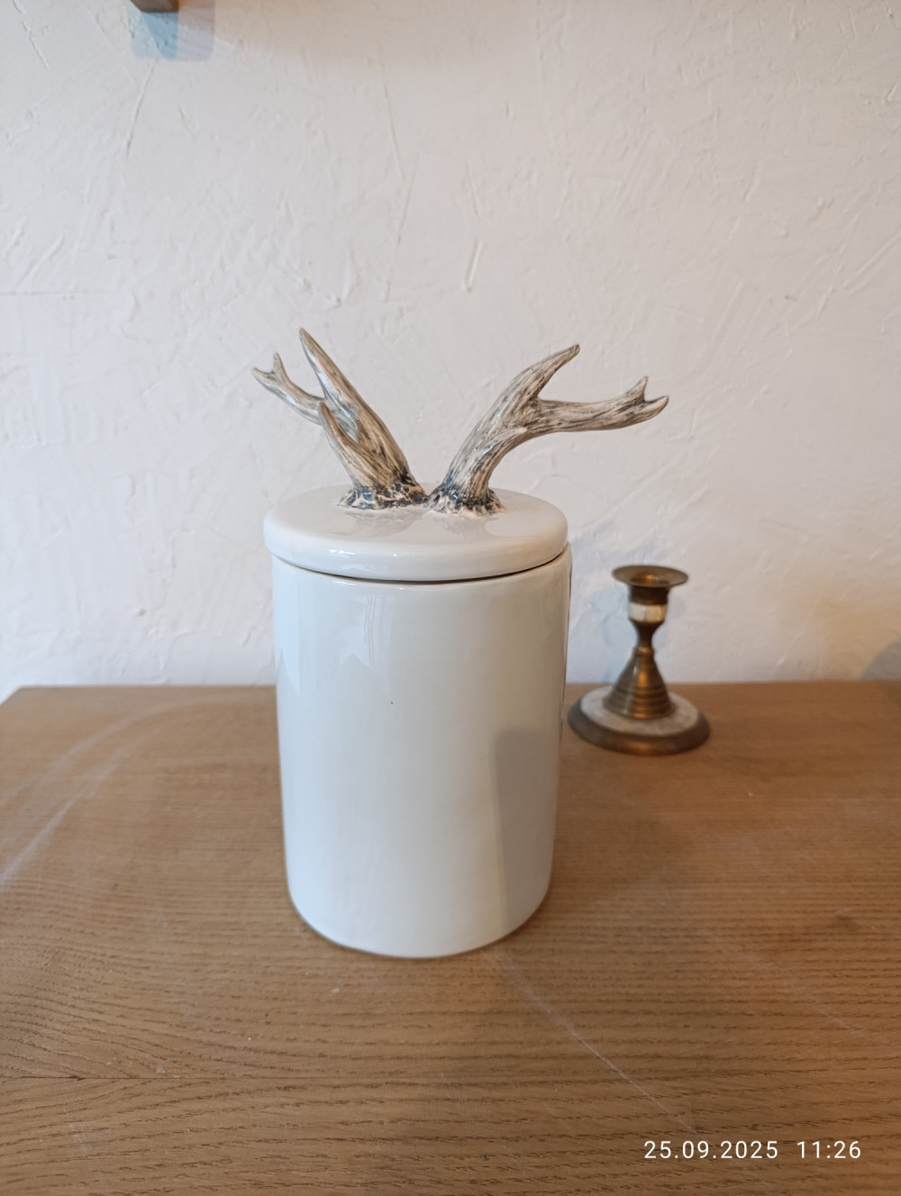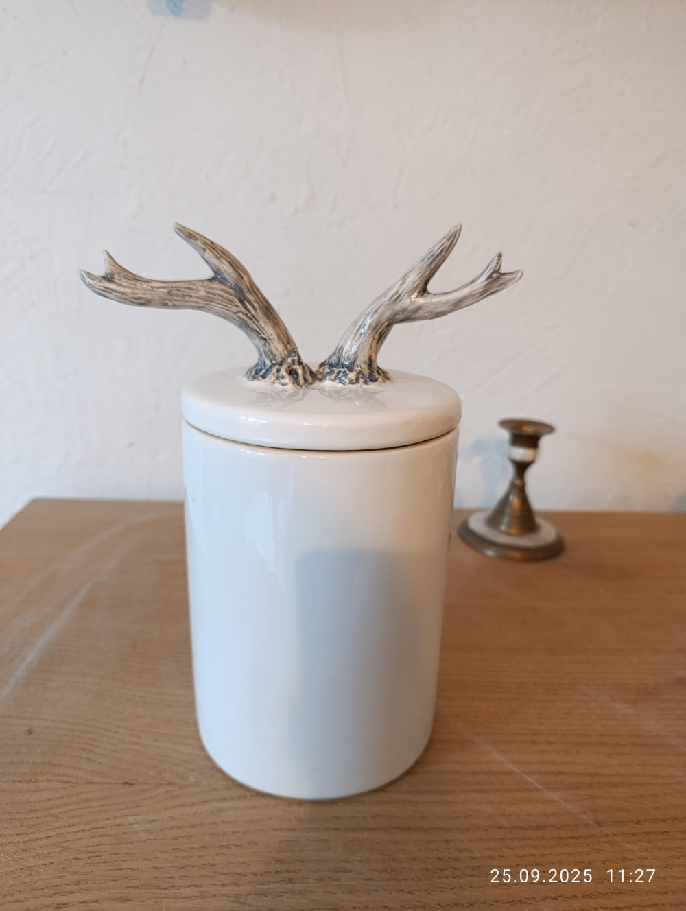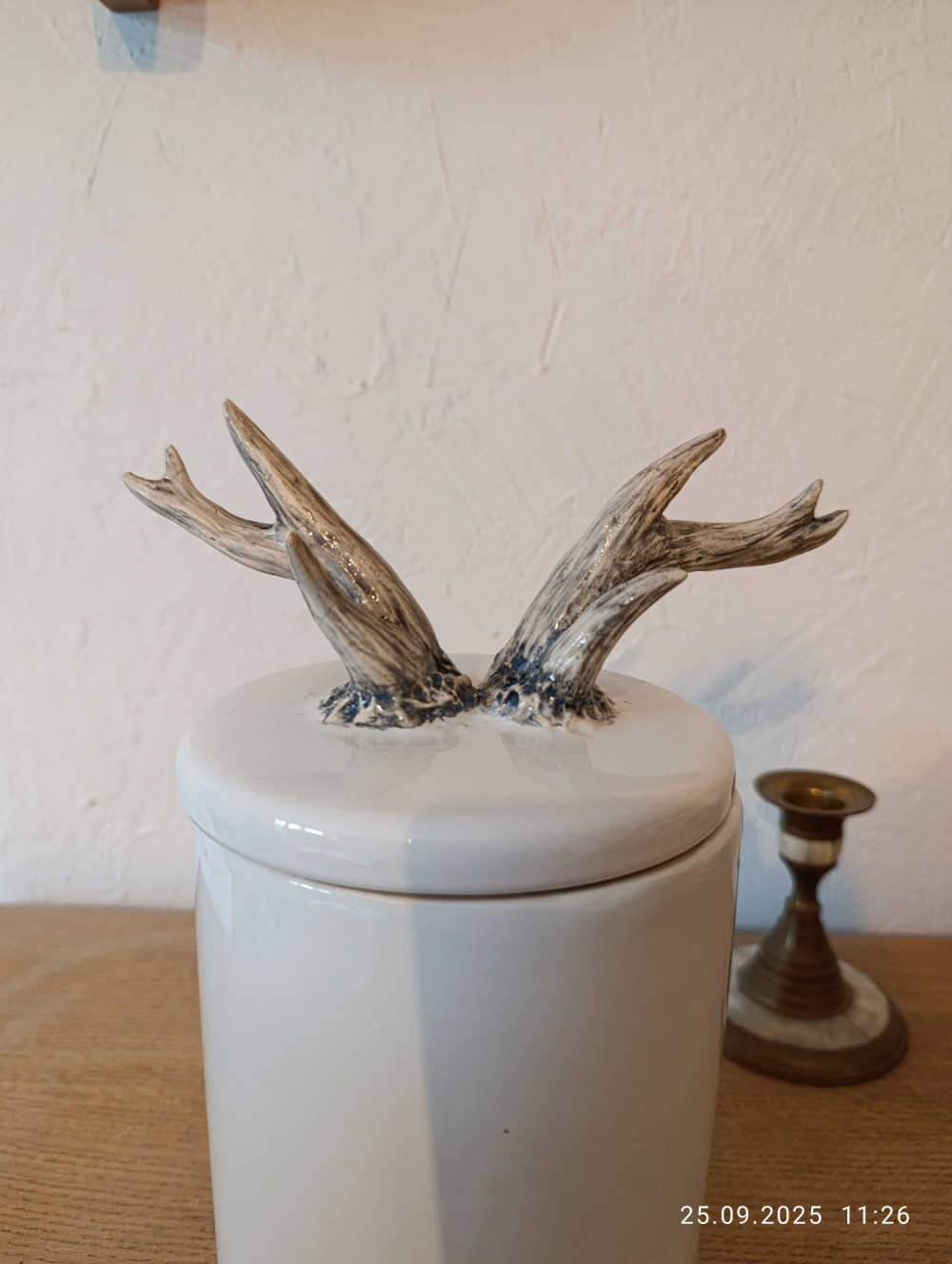 Pojemnik ceramiczny, którego wieko zdobią jelenie poroże. Poroże to nie tylko ozdoba pojemnika, możesz też zawiesić na nim pierścionki czy drobne łańcuszki. Zaś wewnątrz umieścić resztę biżuterii, kosmetyki a nawet produkty spożywcze. Jelenie rogi kształtowane są ręcznie a następnie delikatnie cieniowane farbami podszkliwnymi. Pojemnik szkliwiony białym szkliwem wewnątrz jak i na zewnątrz z możliwością kontaktu z żywnością.