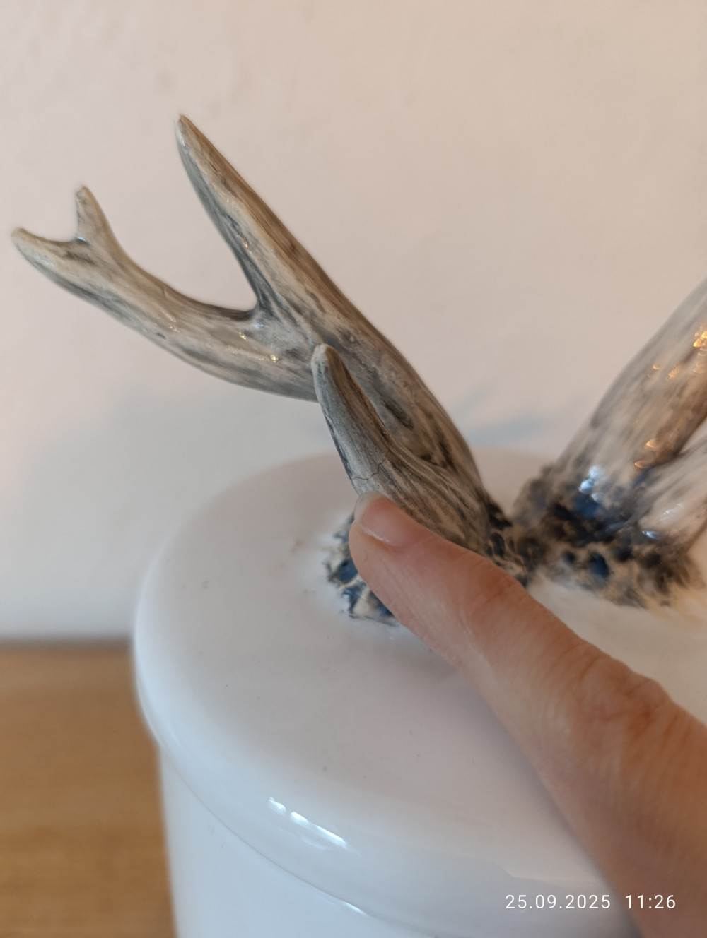 Kawałek poroża został przypadkowo ułamany, a później przyklejony klejem "kropelka". Dodatkowo we wnętrzu białego pojemnika pojawiła się rysa/pęknięcie- nie wychodzi na zewnątrz.