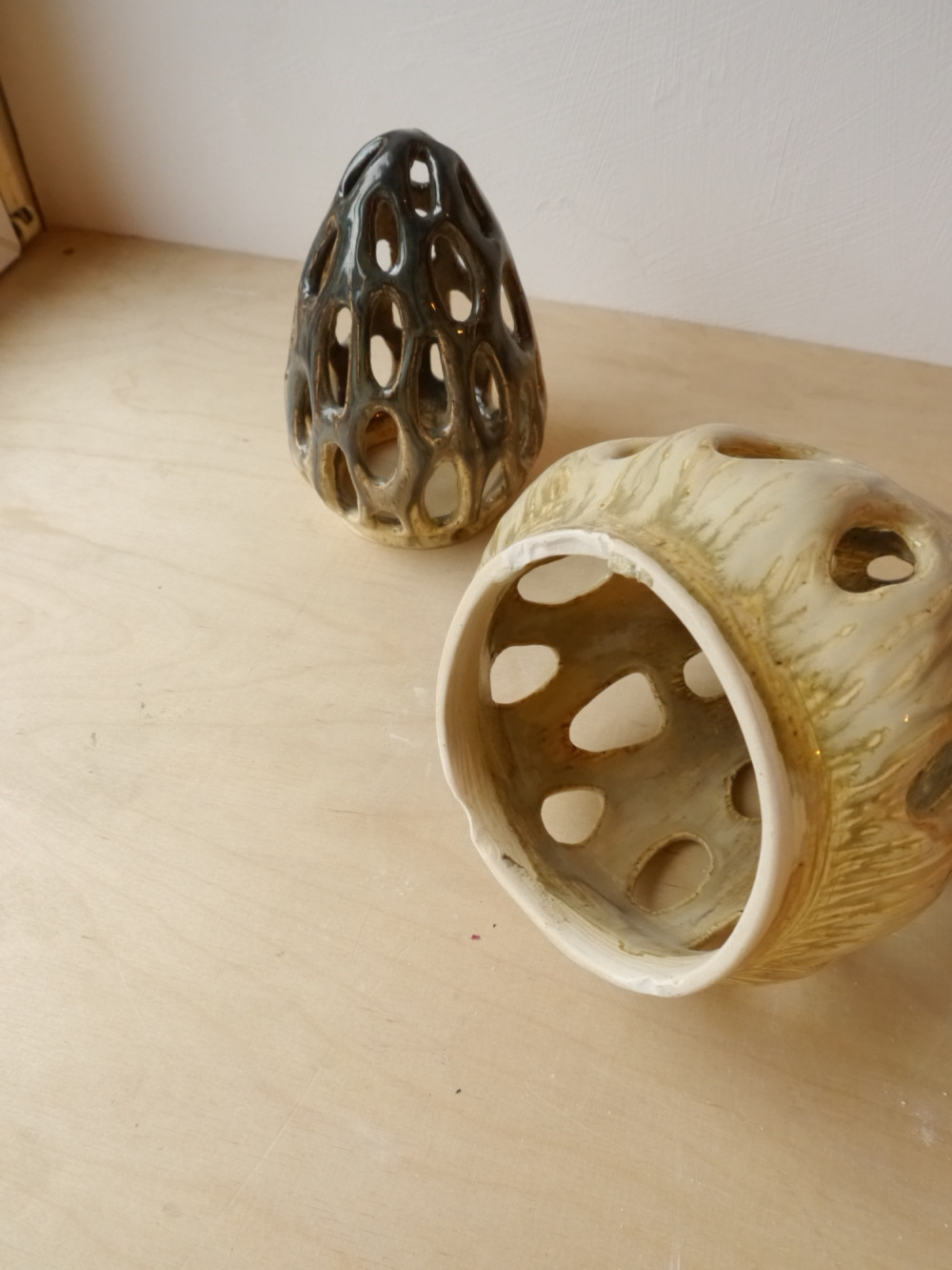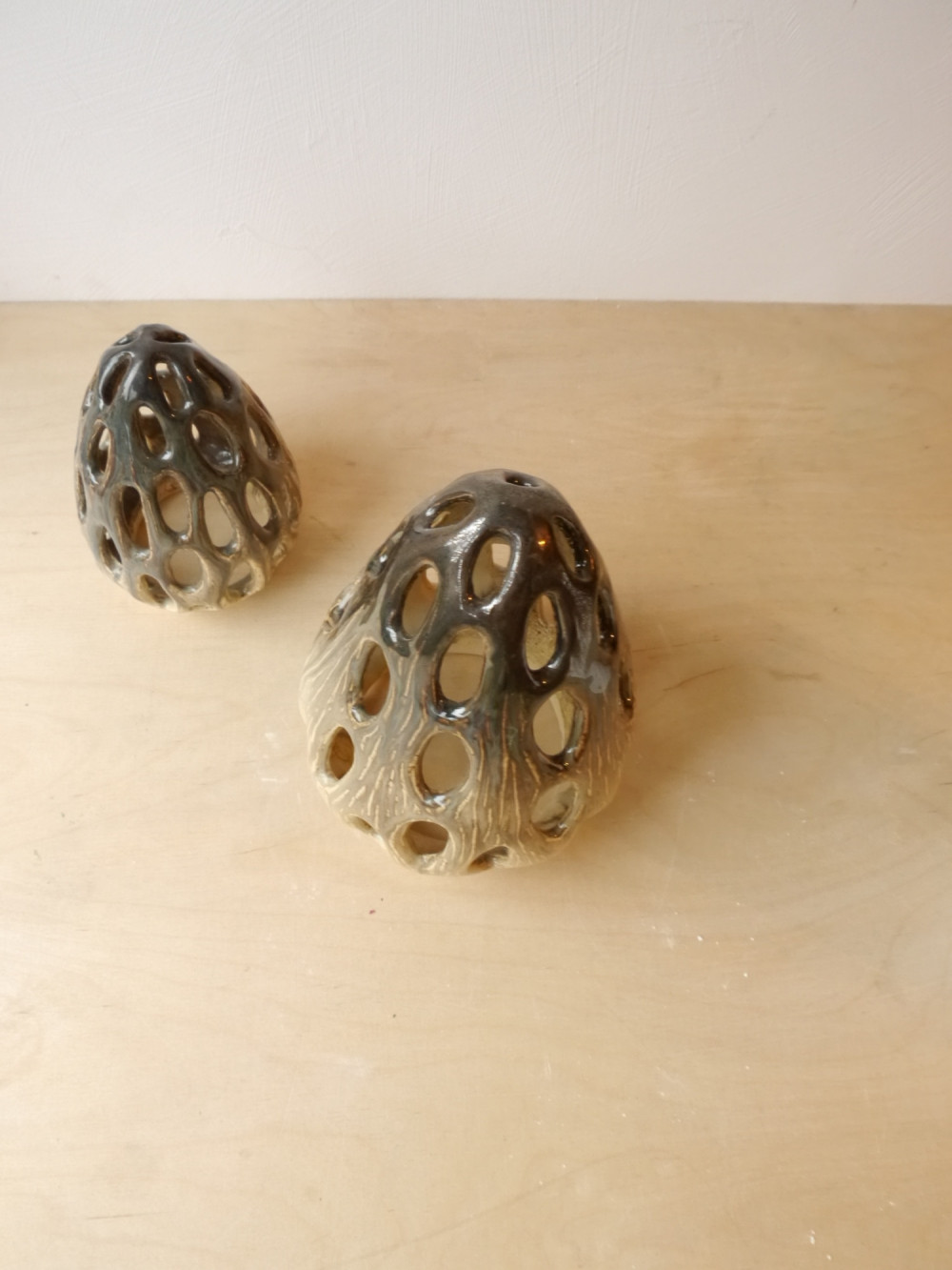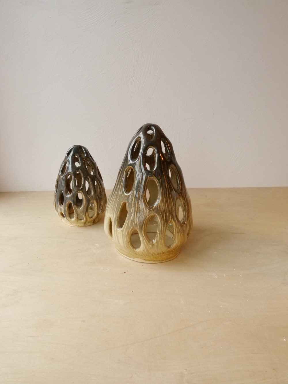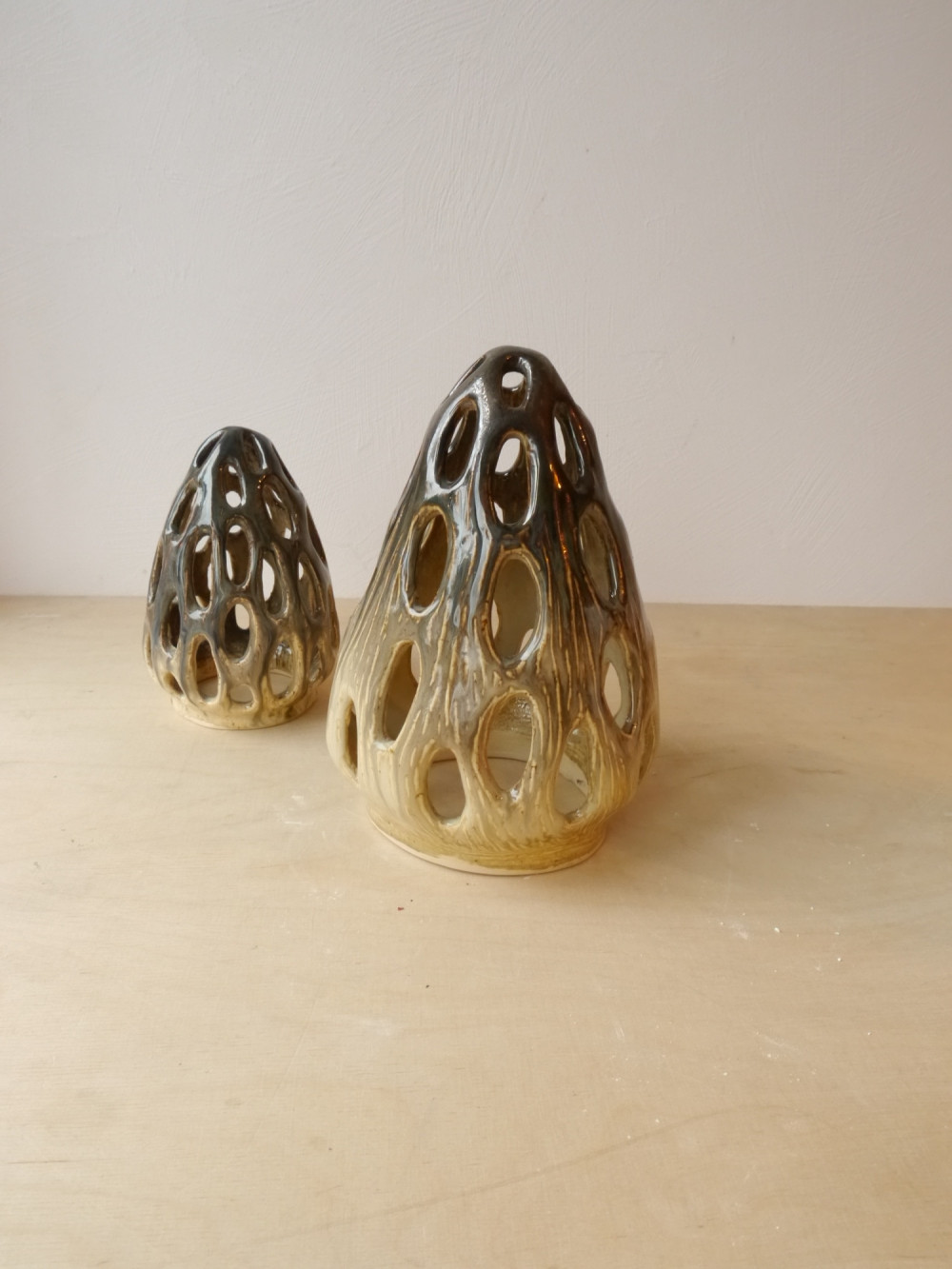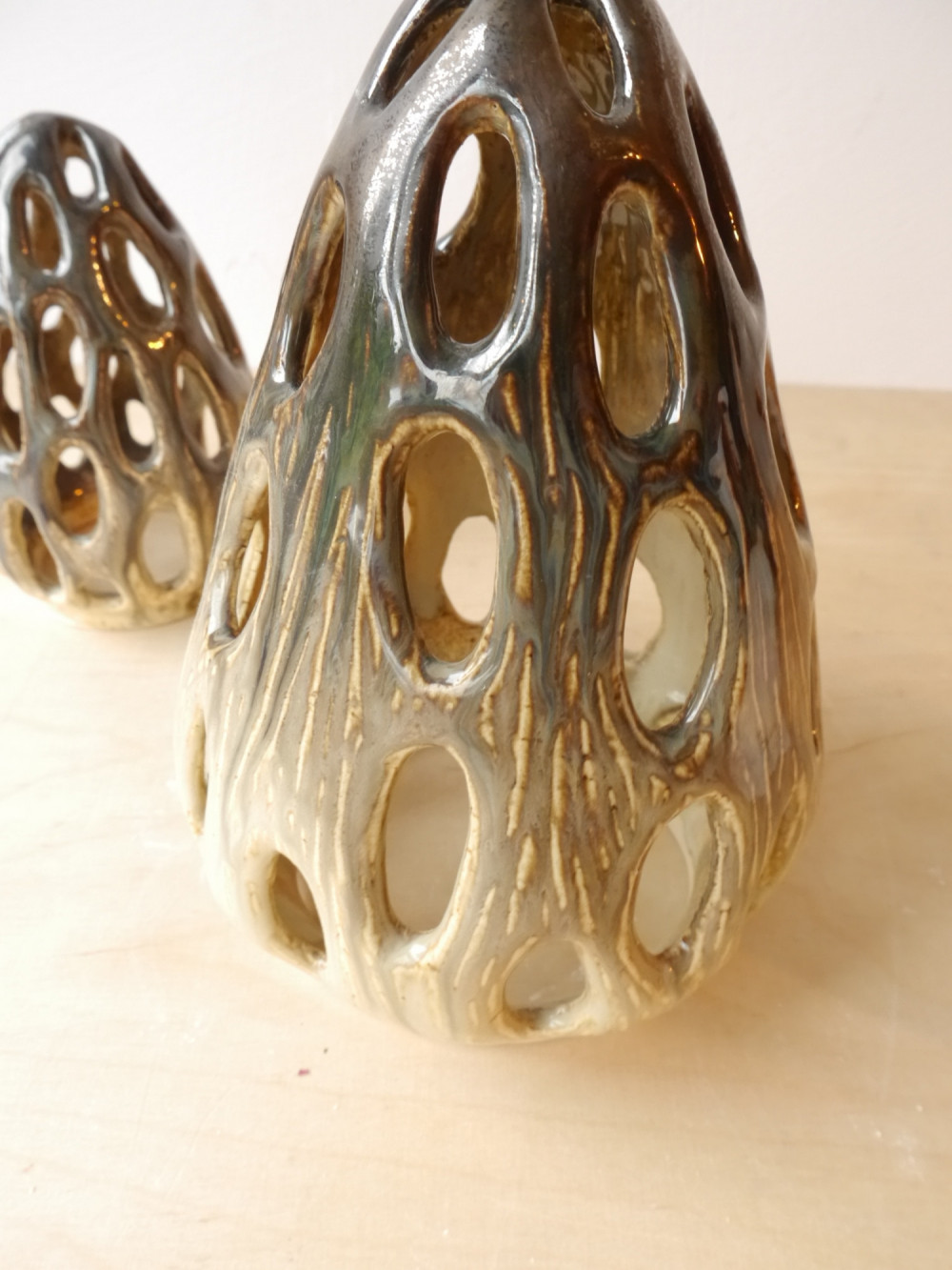 Lampion inspirowany grzybek smardziem. Pokryty beżowo-brązowym szkliwem. Powstała tylko jedna sztuka. Od spodu przykleił się do płyty piecowej i ma nierówne brzegi.